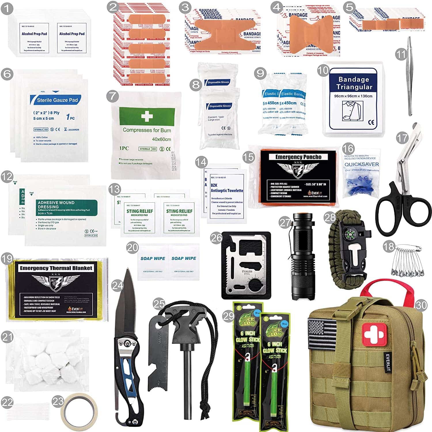 ABD askeri gazileri tarafından benzersiz bir şekilde özelleştirilmiş, EX-Ordu Çavuşu tarafından sahada test edilmiş, sizi acil bir durumda iyi hazırlamak için tasarlanmıştır. Kit, 241 ADET İlk Yardım Tedarikini 9 güçlü Hayatta Kalma Teçhizatı ile bir Olması Gereken EDC acil durum kitinde birleştirir.