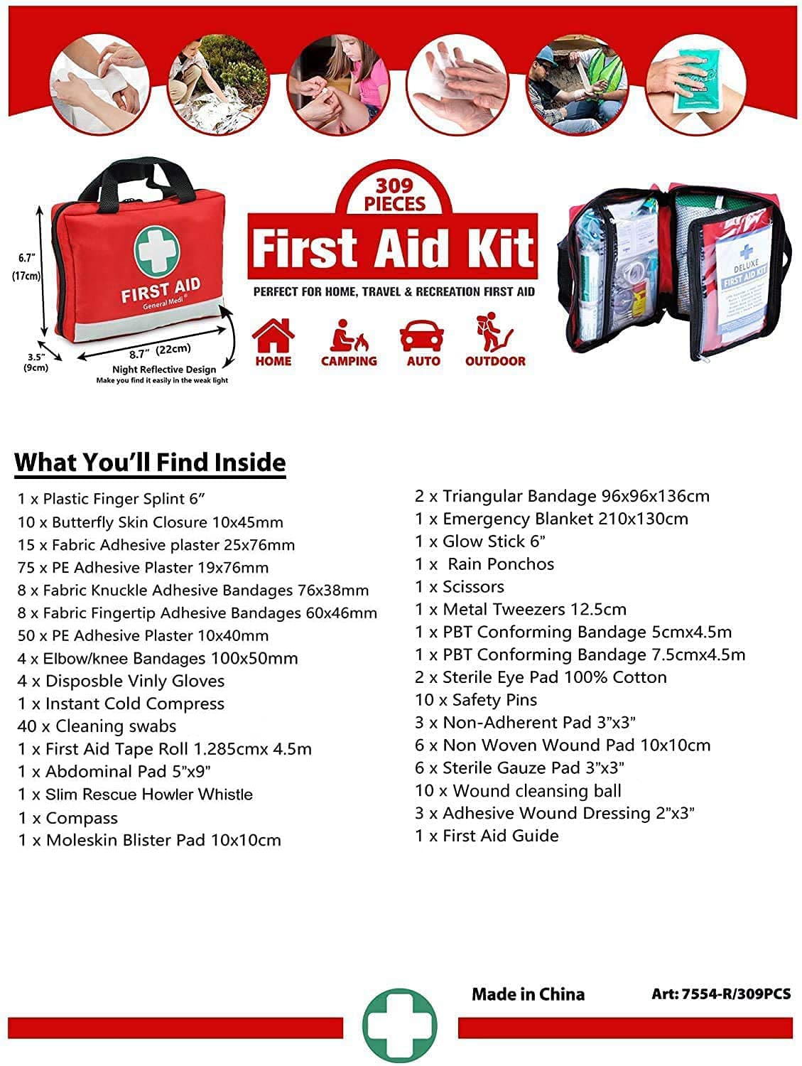 | içerir | 309 kullanışlı ve değerli hastane sınıfı ilk yardım malzemeleri ile paketlenmiştir |